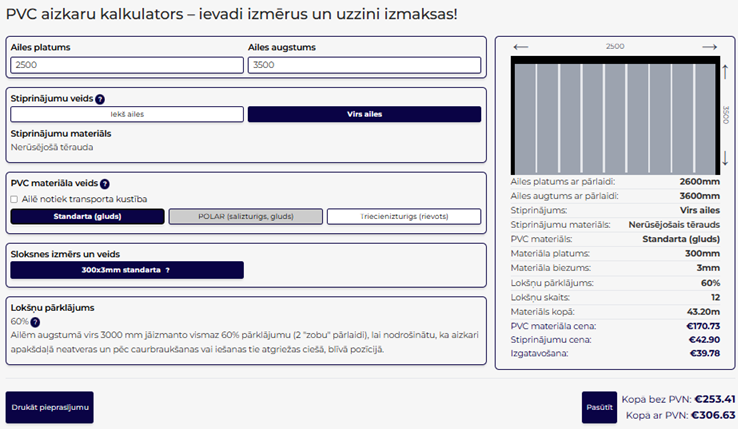 Lai uzzinātu precīzas izmaksas, ievadiet ailes izmērus mūsu PVC aizkaru kalkulatorā un norādiet: