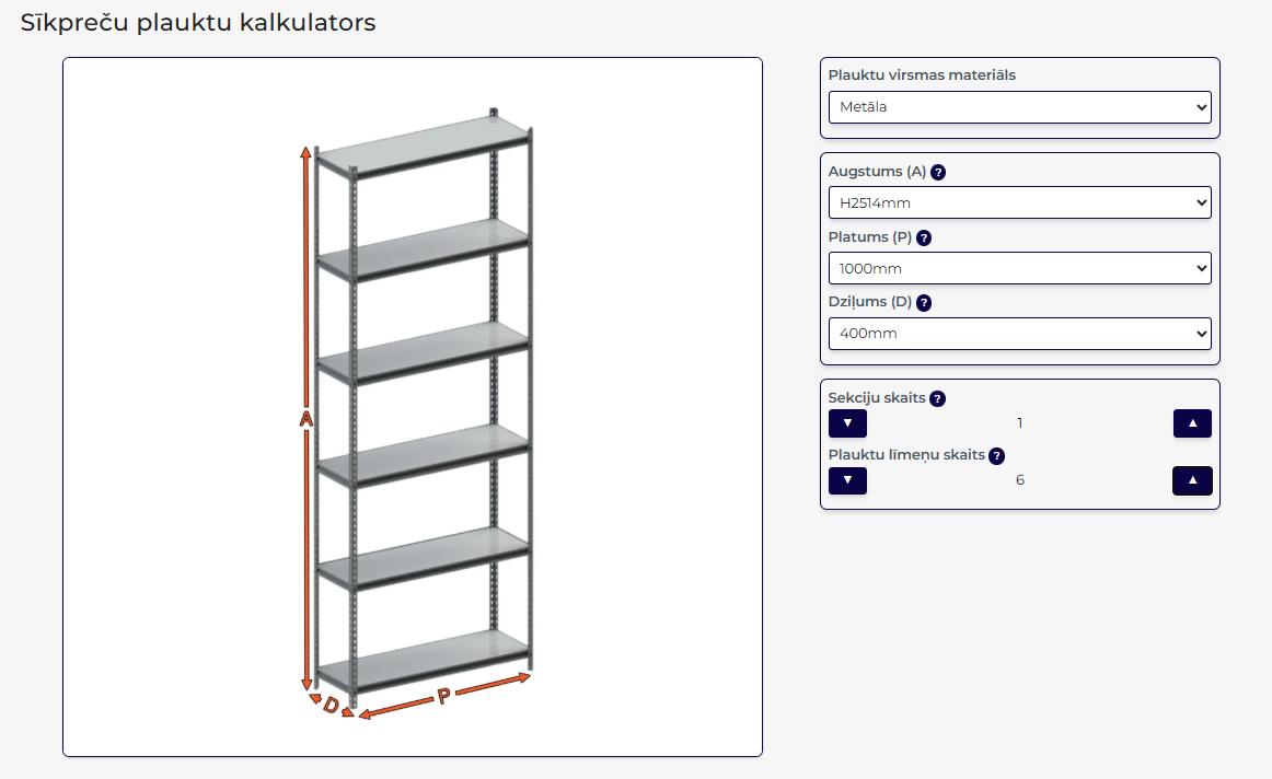Izmanto mūsu sīkpreču plauktu kalkulatoru: https://noliktavaseksperts.coverl.id.lv/sikprecu-plauktu-kalkulators/